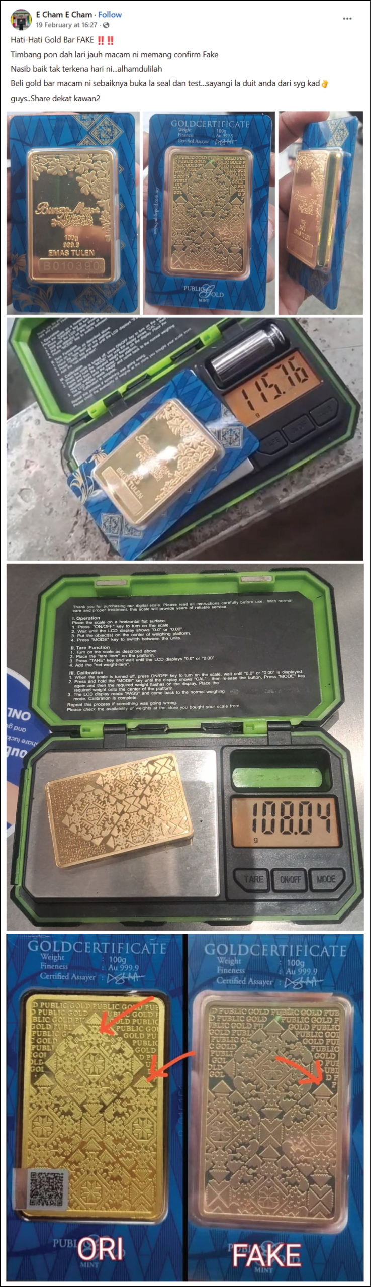 - Apabila ditimbang, berat emas palsu tak tepat (biasanya lari jauh berbanding berat yang ditulis pada sijil emas. Goldbar palsu di atas beratnya 108.04gram apabila ditimbang (lebih 8.04gram).