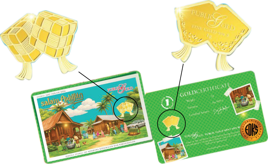 Nampaknya fenomena menukar duit raya => goldbar raya semakin rancak selepas Public Gold memperkenalkan 1gram goldbar berbentuk ‘ketupat’ yang di-laminate pada kad design Aidilfitri. Hasilnya ialah ‘Ketupat Emas’ (or should I call it ‘Ketupat-Bar’?) seperti berikut: