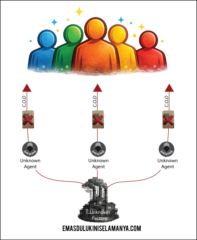 Sebenarnya menjual/beli emas secara COD ada risikonya kerana emas ialah item yang sangat bernilai (mahal harganya) dan complex (pelbagai ujian perlu dilakukan jika mahu mengesahkan ketulenannya). Sebab itulah jarang orang membeli emas secara COD melainkan dia betul-betul mempercayai ejen yang menjual emas tersebut.